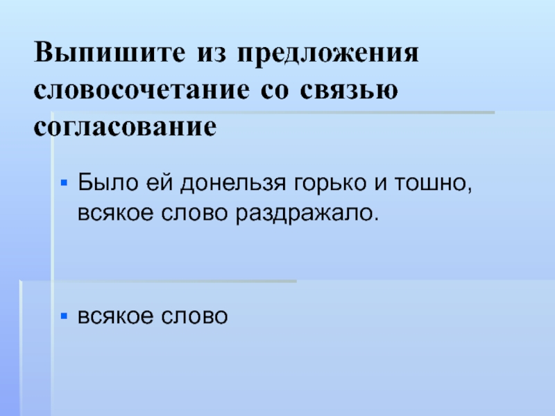 Выпишите из предложения словосочетание со связью согласованиеБыло ей донельзя горько и тошно, всякое слово раздражало.всякое слово