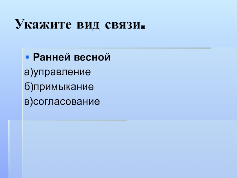 Укажите вид связи.Ранней веснойа)управлениеб)примыканиев)согласование