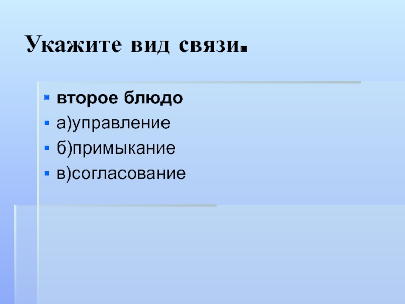 Укажите вид связи.второе блюдо а)управление  б)примыкание  в)согласование