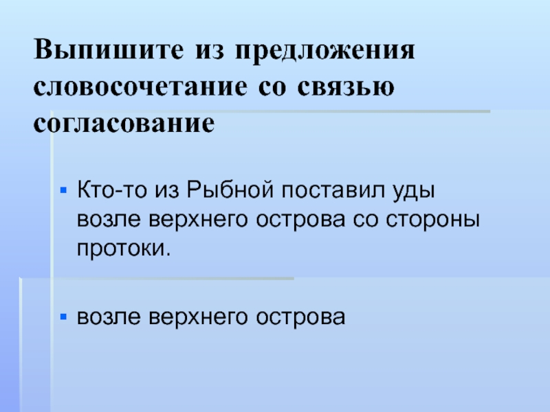 Выпишите из предложения словосочетание со связью согласованиеКто-то из Рыбной поставил уды возле верхнего острова со стороны протоки.возле