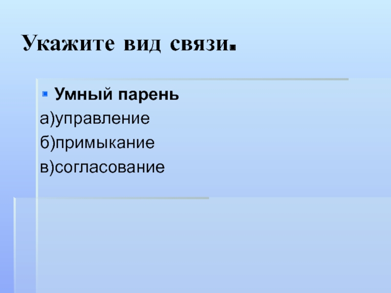 Укажите вид связи.Умный пареньа)управлениеб)примыканиев)согласование