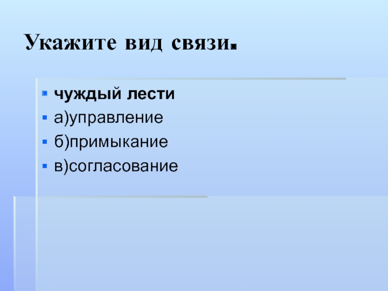 Укажите вид связи.чуждый лести а)управлениеб)примыканиев)согласование