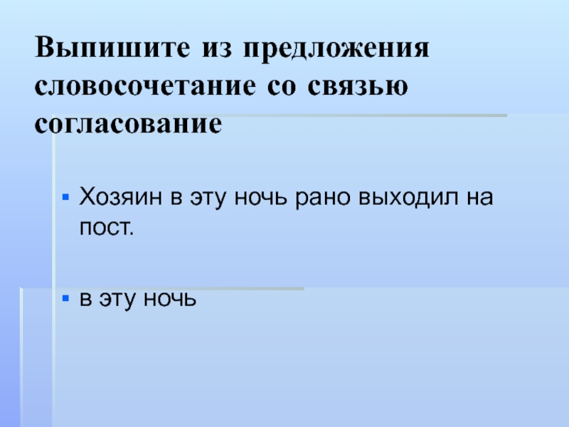 Выпишите из предложения словосочетание со связью согласованиеХозяин в эту ночь рано выходил на пост.в эту ночь