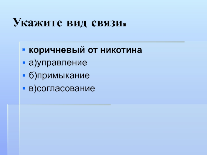 Укажите вид связи.коричневый от никотина а)управлениеб)примыканиев)согласование