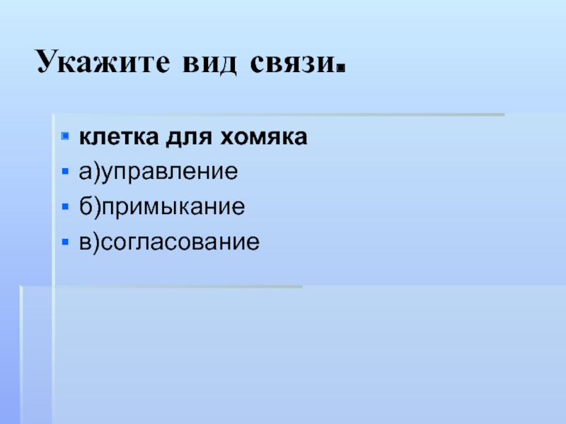 Укажите вид связи.клетка для хомяка а)управлениеб)примыканиев)согласование