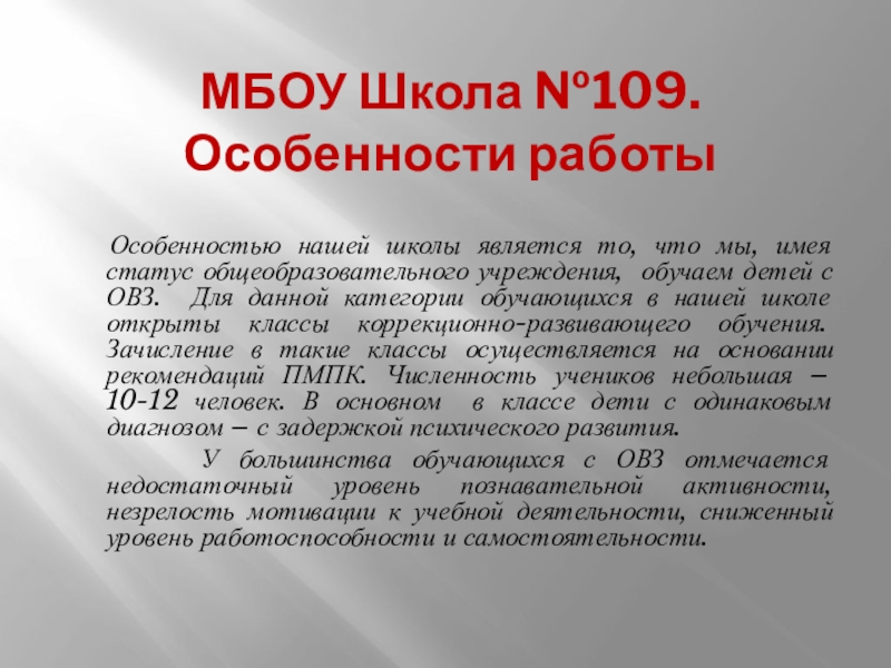 что мы, имея статус общеобразовательного учреждения, обучаем детей с ОВЗ. Для данной категории обучающихся в нашей школе открыты классы коррекционно-развивающего обучения. Зачисление в такие классы осуществляется на основании рекомендаций ПМПК. Численность учеников небольшая – 10-12 человек. В основном в классе дети с одинаковым диагнозом – с задержкой психического развития.