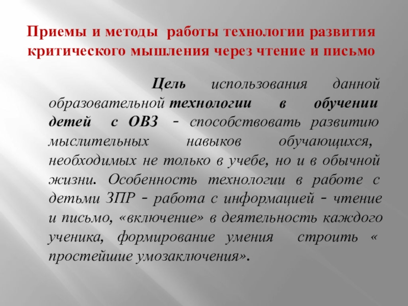Цель использования данной образовательной технологии в обучении детей с ОВЗ - способствовать развитию мыслительных навыков обучающихся, необходимых не только в учебе, но и в обычной жизни. Особенность технологии в работе с детьми ЗПР - работа с информацией - чтение и письмо, «включение» в деятельность каждого ученика, формирование умения строить « простейшие умозаключения».