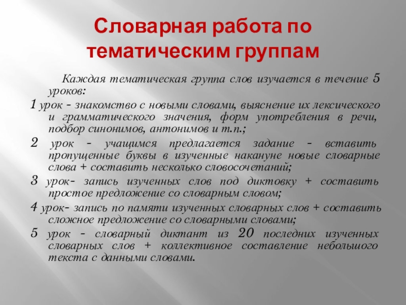 1 урок - знакомство с новыми словами, выяснение их лексического и грамматического значения, форм употребления в речи, подбор синонимов, антонимов и т.п.;