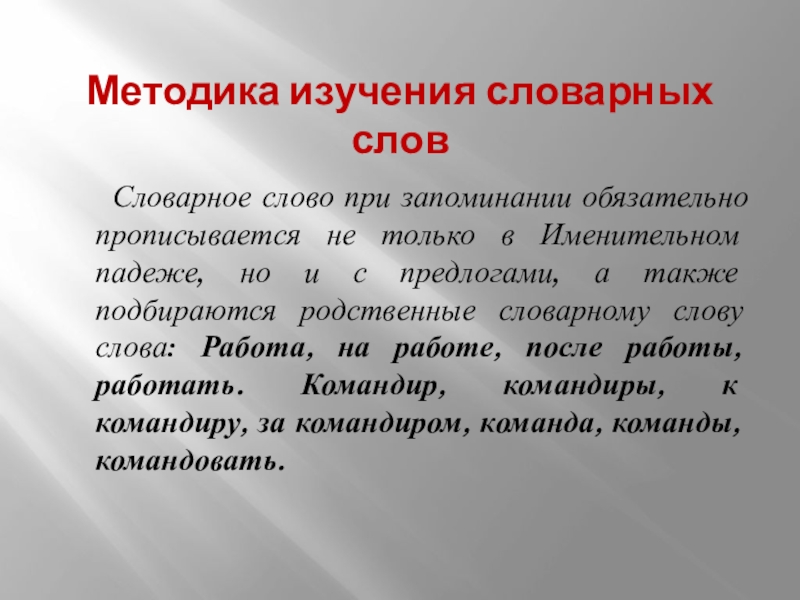 прописывается не только в Именительном падеже, но и с предлогами, а также подбираются родственные словарному слову слова: Работа, на работе, после работы, работать. Командир, командиры, к командиру, за командиром, команда, команды, командовать.