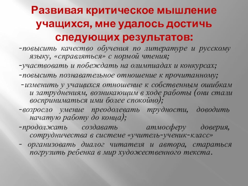 Слайд 35Развивая критическое мышление учащихся, мне удалось достичь следующих результатов: