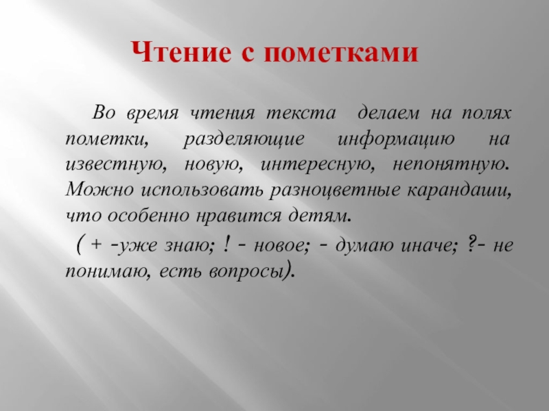 полях пометки, разделяющие информацию на известную, новую, интересную, непонятную. Можно использовать разноцветные карандаши, что особенно нравится детям.