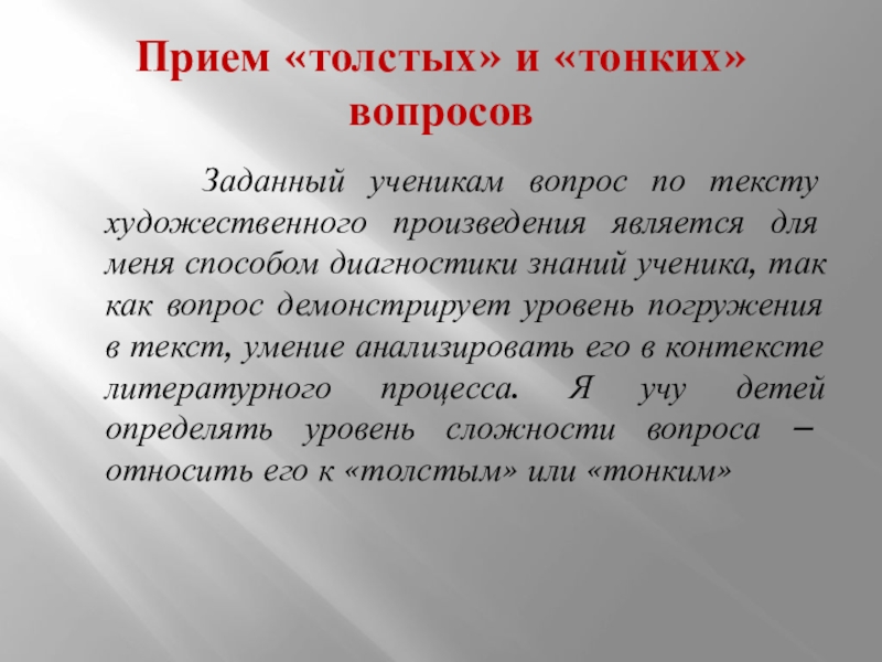 тексту художественного произведения является для меня способом диагностики знаний ученика, так как вопрос демонстрирует уровень погружения в текст, умение анализировать его в контексте литературного процесса. Я учу детей определять уровень сложности вопроса – относить его к «толстым» или «тонким»