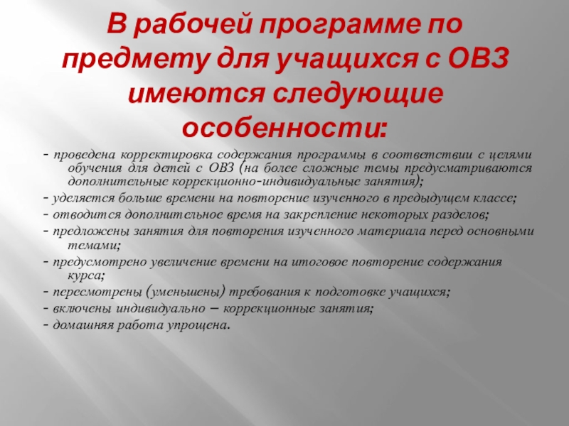 Слайд 6В рабочей программе по предмету для учащихся с ОВЗ имеются следующие