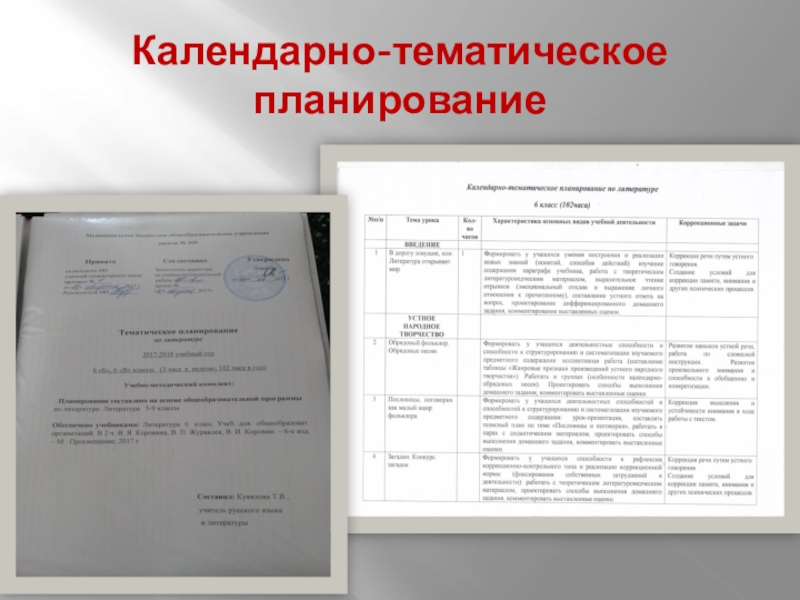 основная общеобразовательная программа основного общего образования МБОУ Школы №109, авторская программа по предмету (обучение русскому языку ведется по программе Т. А. Ладыженской, М.Т. Баранова, по литературе – по программе под редакцией В.Я. Коровиной). Приложением к рабочей программе учителя является календарно-тематическое планирование, которое включает в себя основные разделы курса, темы, коррекционно-развивающие задачи, характеристику основных видов учебной деятельности.