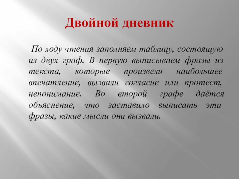 двух граф. В первую выписываем фразы из текста, которые произвели наибольшее впечатление, вызвали согласие или протест, непонимание. Во второй графе даётся объяснение, что заставило выписать эти фразы, какие мысли они вызвали.