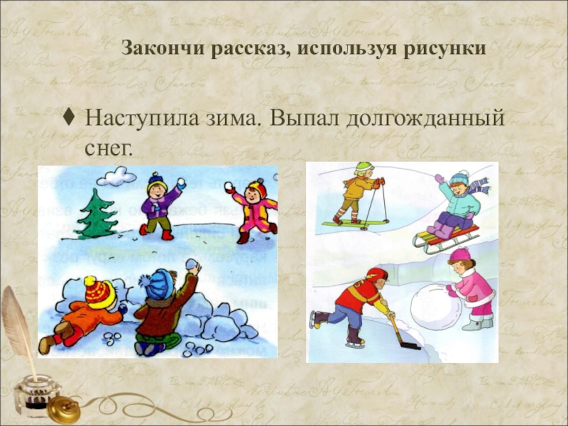 Слайд 5Составление рассказа по заданному началу, картинкам и ключевым словам.
