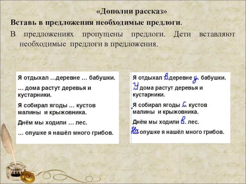 В предложениях пропущены предлоги. Дети вставляют необходимые предлоги в предложения.