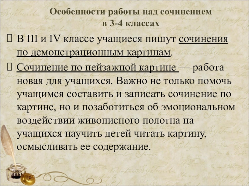 Сочинение по пейзажной картине — работа новая для учащихся. Важно не только помочь учащимся составить и записать сочинение по картине, но и позаботиться об эмоциональном воздействии живописного полотна на учащихся научить детей читать картину, осмысливать ее содержание.