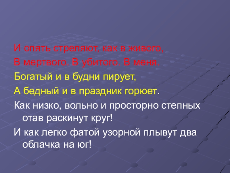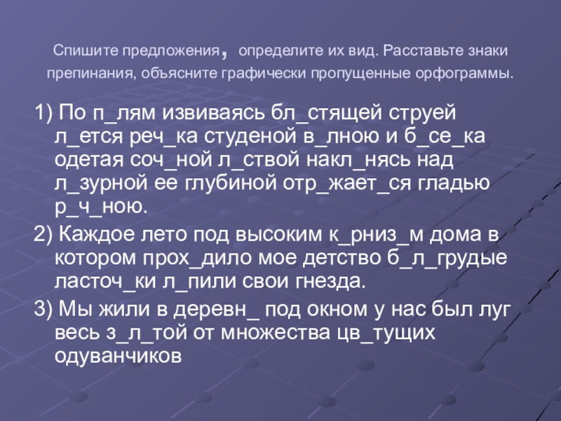 1) По п_лям извиваясь бл_стящей струей л_ется реч_ка студеной в_лною и б_се_ка одетая соч_ной л_ствой накл_нясь над л_зурной ее глубиной отр_жает_ся гладью р_ч_ною.