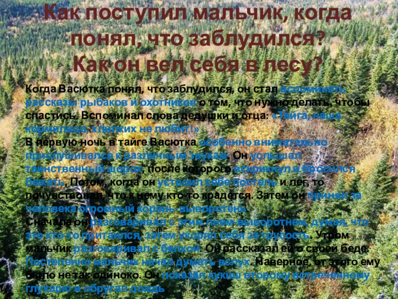 Когда Васютка понял, что заблудился, он стал вспоминать рассказы рыбаков и охотников о том, что нужно делать, чтобы спастись. Вспоминал слова дедушки и отца: «Тайга, наша кормилица, хлипких не любит!»
