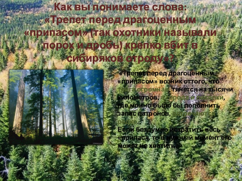«Трепет перед драгоценным «припасом» возник оттого, что тайга огромная, тянется на тысячи километров, а города и поселки, где можно было бы пополнить запас патронов, встречаются редко.
