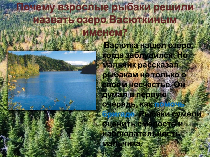 Слайд 15Почему взрослые рыбаки решили назвать озеро Васюткиным именем?