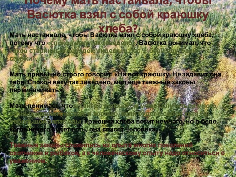 Слайд 11Почему мать настаивала, чтобы Васютка взял с собой краюшку хлеба?