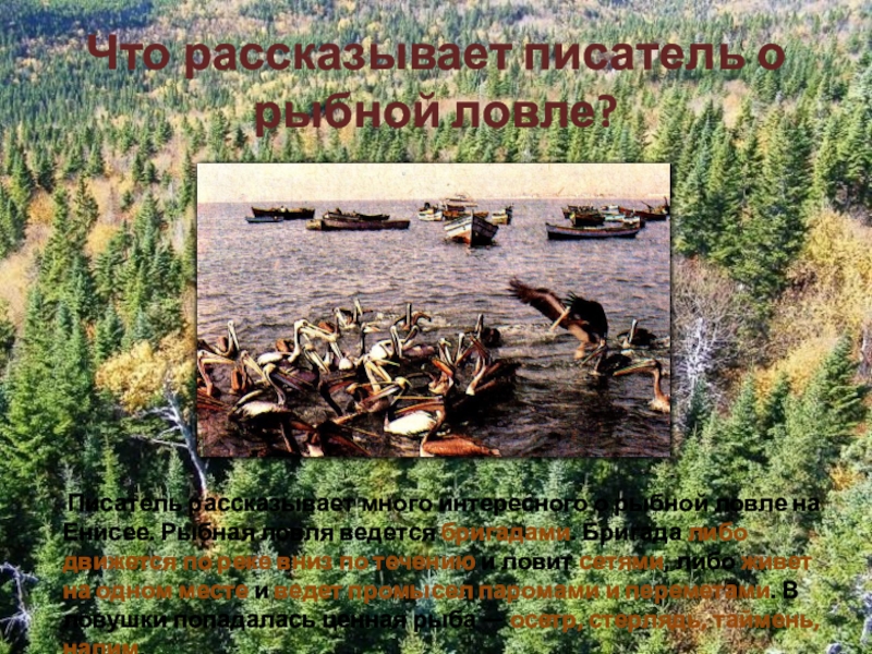 Слайд 8Что рассказывает писатель о рыбной ловле?