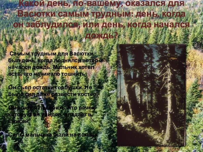 Слайд 13Какой день, по-вашему, оказался для Васютки самым трудным: день, когда он