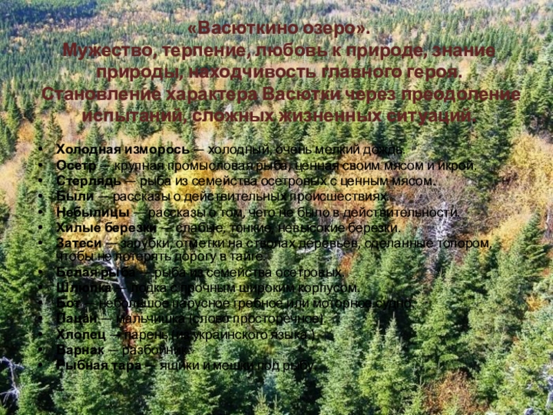 Становление характера Васютки через преодоление испытаний, сложных жизненных ситуаций.