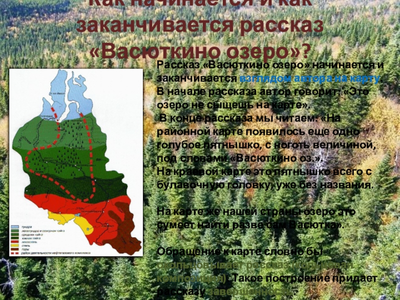 В конце рассказа мы читаем: «На районной карте появилось еще одно голубое пятнышко, с ноготь величиной, под словами «Васюткино оз.».