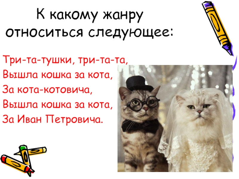 К какому жанру относиться следующее:Три-та-тушки, три-та-та,Вышла кошка за кота, За кота-котовича,Вышла кошка за кота, За Иван Петровича.