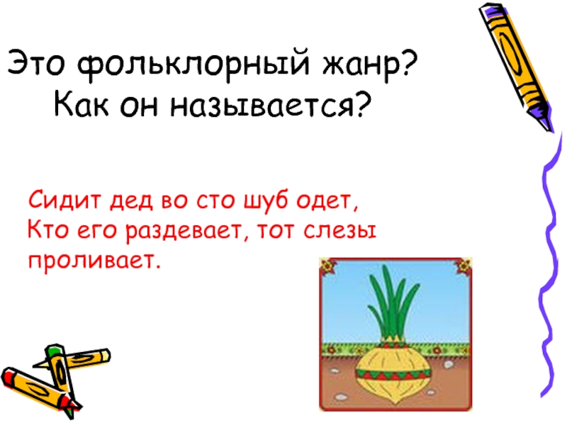 Это фольклорный жанр? Как он называется?  Сидит дед во сто шуб одет, Кто его раздевает, тот