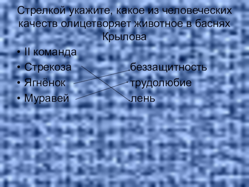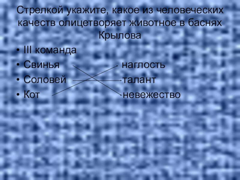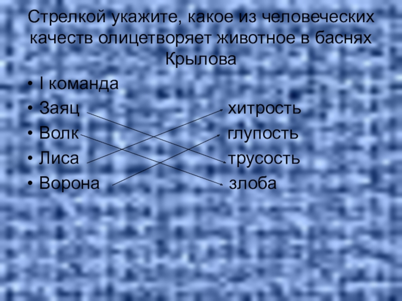 Слайд 5Стрелкой укажите, какое из человеческих качеств олицетворяет животное в баснях Крылова