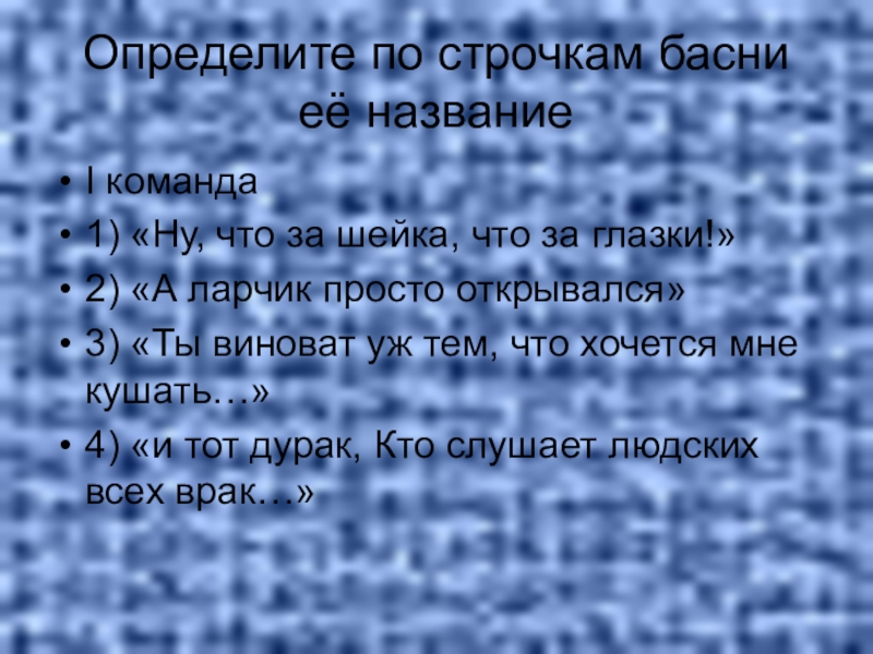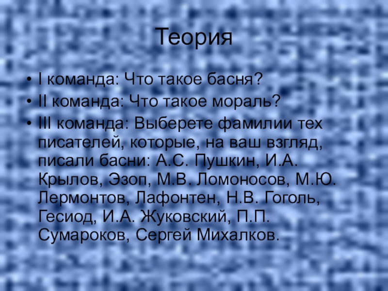 фамилии тех писателей, которые, на ваш взгляд, писали басни: А.С. Пушкин, И.А. Крылов, Эзоп, М.В. Ломоносов, М.Ю. Лермонтов, Лафонтен, Н.В. Гоголь, Гесиод, И.А. Жуковский, П.П. Сумароков, Сергей Михалков.