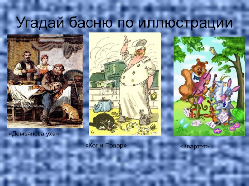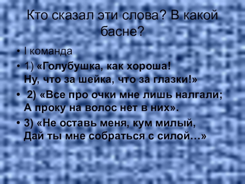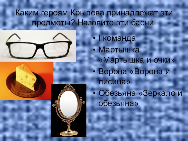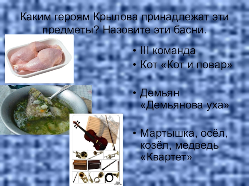 Слайд 8Каким героям Крылова принадлежат эти предметы? Назовите эти басни.