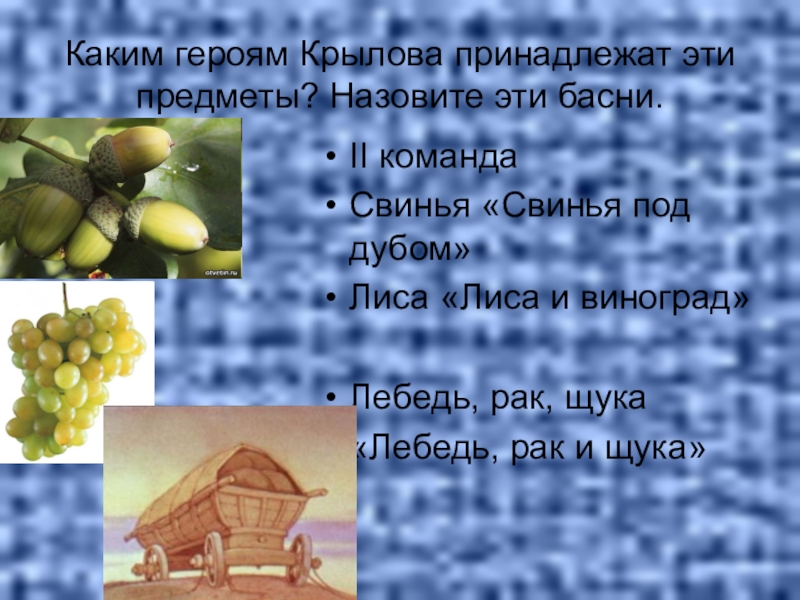Слайд 10Каким героям Крылова принадлежат эти предметы? Назовите эти басни.