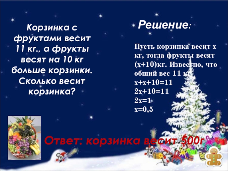 Пусть корзинка весит х кг, тогда фрукты весят (х+10)кг. Известно, что общий вес 11 кг.