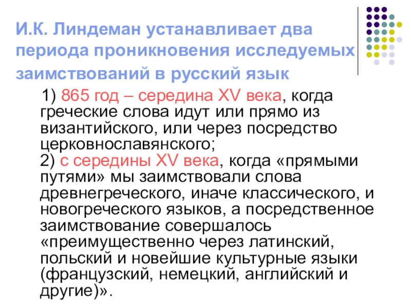 1) 865 год – середина ХV века, когда греческие слова идут или прямо из византийского, или через посредство церковнославянского;