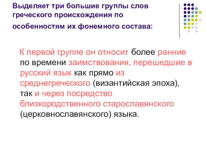 К первой группе он относит более ранние по времени заимствования, перешедшие в русский язык как прямо из среднегреческого (византийская эпоха), так и через посредство близкородственного старославянского (церковнославянского) языка.
