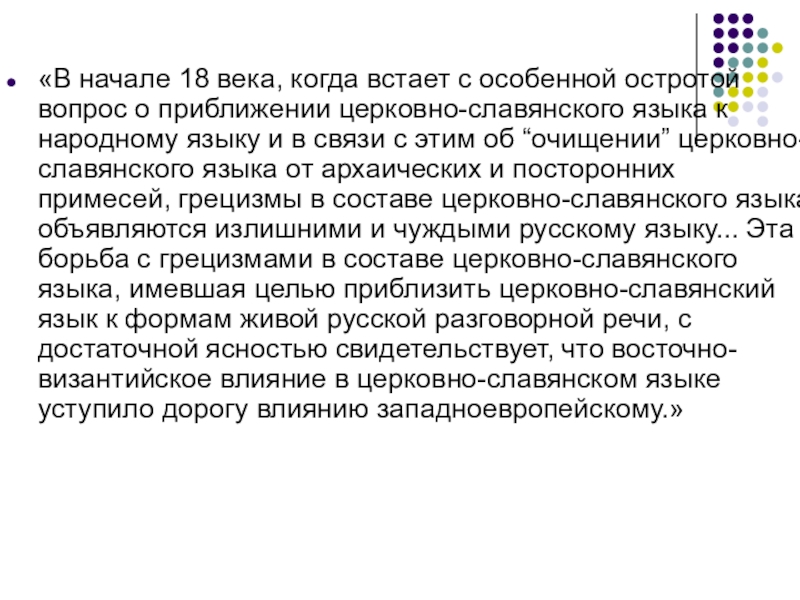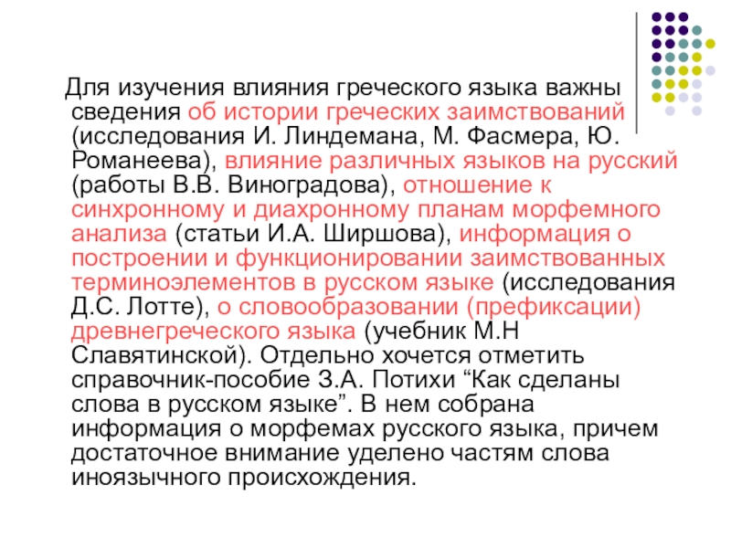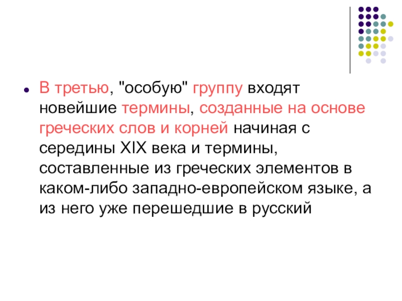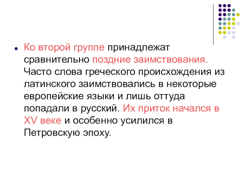 2) с середины ХV века, когда «прямыми путями» мы заимствовали слова древнегреческого, иначе классического, и новогреческого языков, а посредственное заимствование совершалось «преимущественно через латинский, польский и новейшие культурные языки (французский, немецкий, английский и другие)».