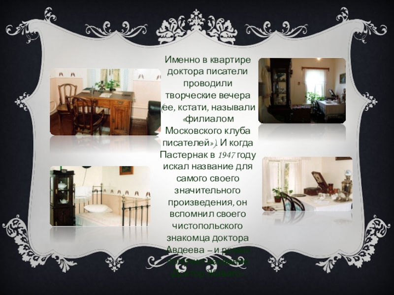 Слайд 10Именно в квартире доктора писатели проводили творческие вечера (ее, кстати, называли
