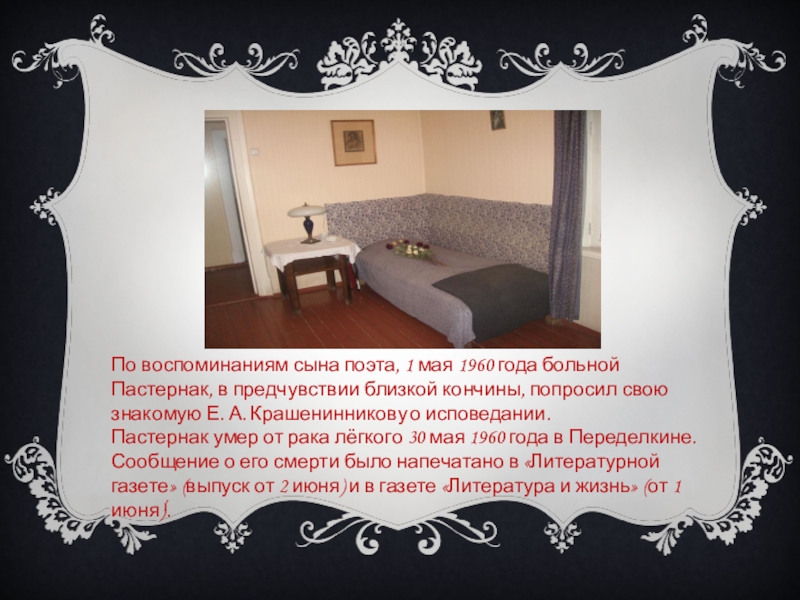 Слайд 19По воспоминаниям сына поэта, 1 мая 1960 года больной Пастернак, в
