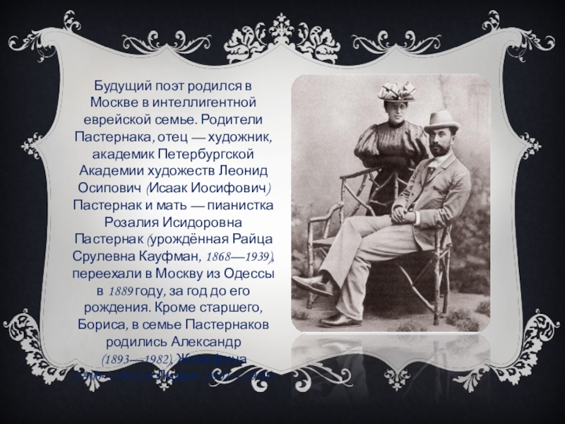 Слайд 2Будущий поэт родился в Москве в интеллигентной еврейской семье. Родители Пастернака,