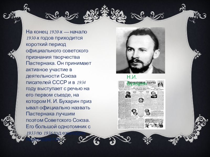 признания творчества Пастернака. Он принимает активное участие в деятельности Союза писателей СССР и в 1934 году выступает с речью на его первом съезде, на котором Н. И. Бухарин призывал официально назвать Пастернака лучшим поэтом Советского Союза. Его большой однотомник с 1933 по 1936 год ежегодно переиздаётся.
