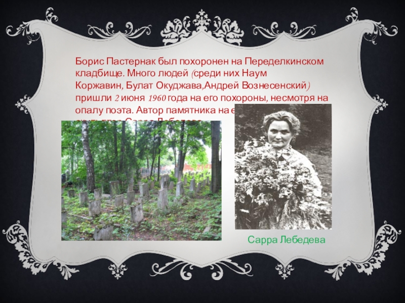 Слайд 20Борис Пастернак был похоронен на Переделкинском кладбище. Много людей (среди них Наум Коржавин, Булат