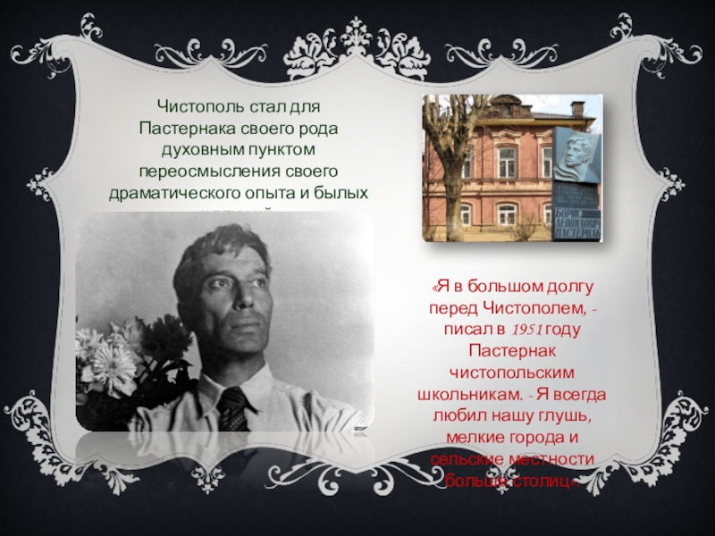 «Я в большом долгу перед Чистополем, - писал в 1951 году Пастернак чистопольским школьникам. - Я всегда любил нашу глушь, мелкие города и сельские местности больше столиц».