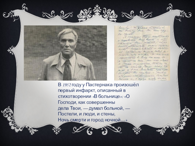 Слайд 18В 1952 году у Пастернака произошёл первый инфаркт, описанный в стихотворении