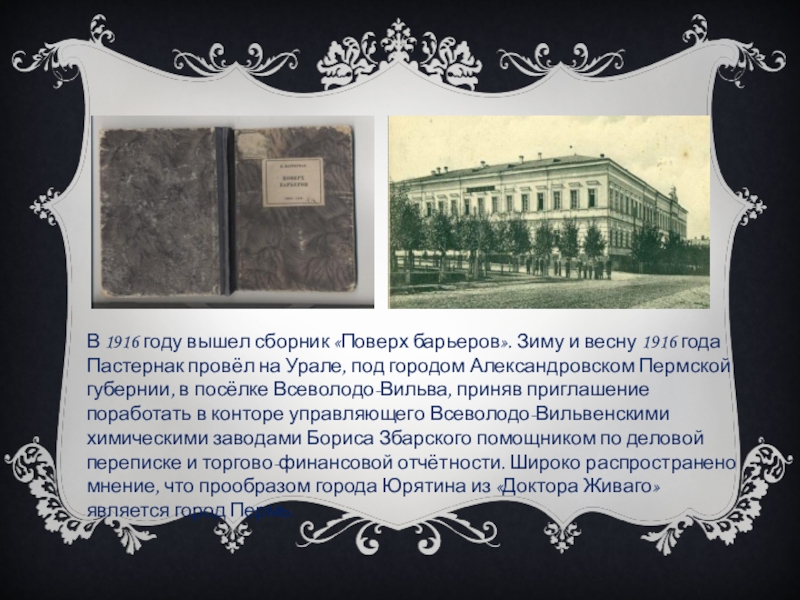 провёл на Урале, под городом Александровском Пермской губернии, в посёлке Всеволодо-Вильва, приняв приглашение поработать в конторе управляющего Всеволодо-Вильвенскими химическими заводами Бориса Збарского помощником по деловой переписке и торгово-финансовой отчётности. Широко распространено мнение, что прообразом города Юрятина из «Доктора Живаго» является город Пермь.