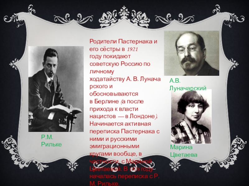 ходатайству А. В. Луначарского и обосновываются в Берлине (а после прихода к власти нацистов — в Лондоне). Начинается активная переписка Пастернака с ними и русскими эмиграционными кругами вообще, в частности, с Мариной Цветаевой. В 1926 году началась переписка с Р.М. Рильке.